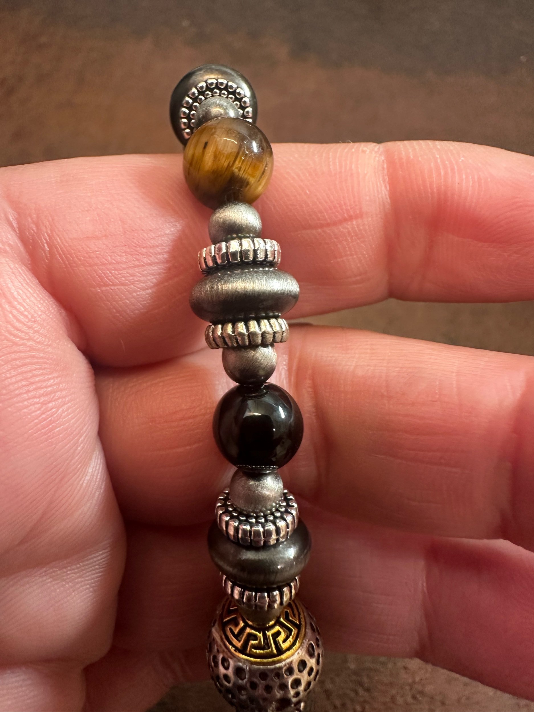 This elegant 8in bracelet features a stunning combination of stainless steel, acrylic, tiger’s eye and black agate beads, perfect for adding a touch of sophistication to any outfit.