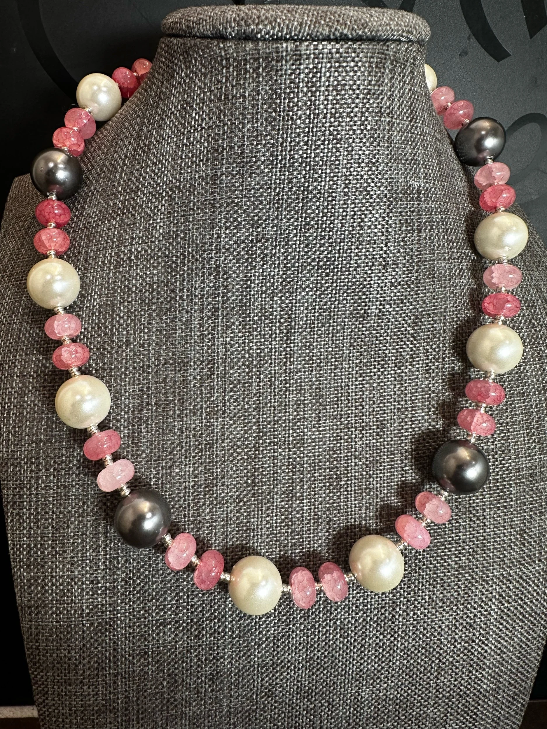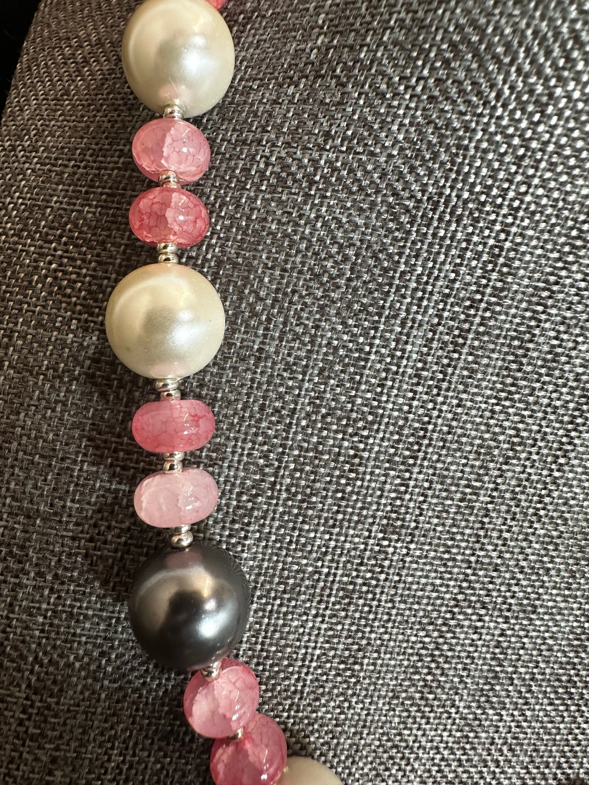 This elegant 17in necklace features a stunning combination of pink crackle quartz beads and classic pearl accents, perfect for adding a touch of sophistication to any outfit.