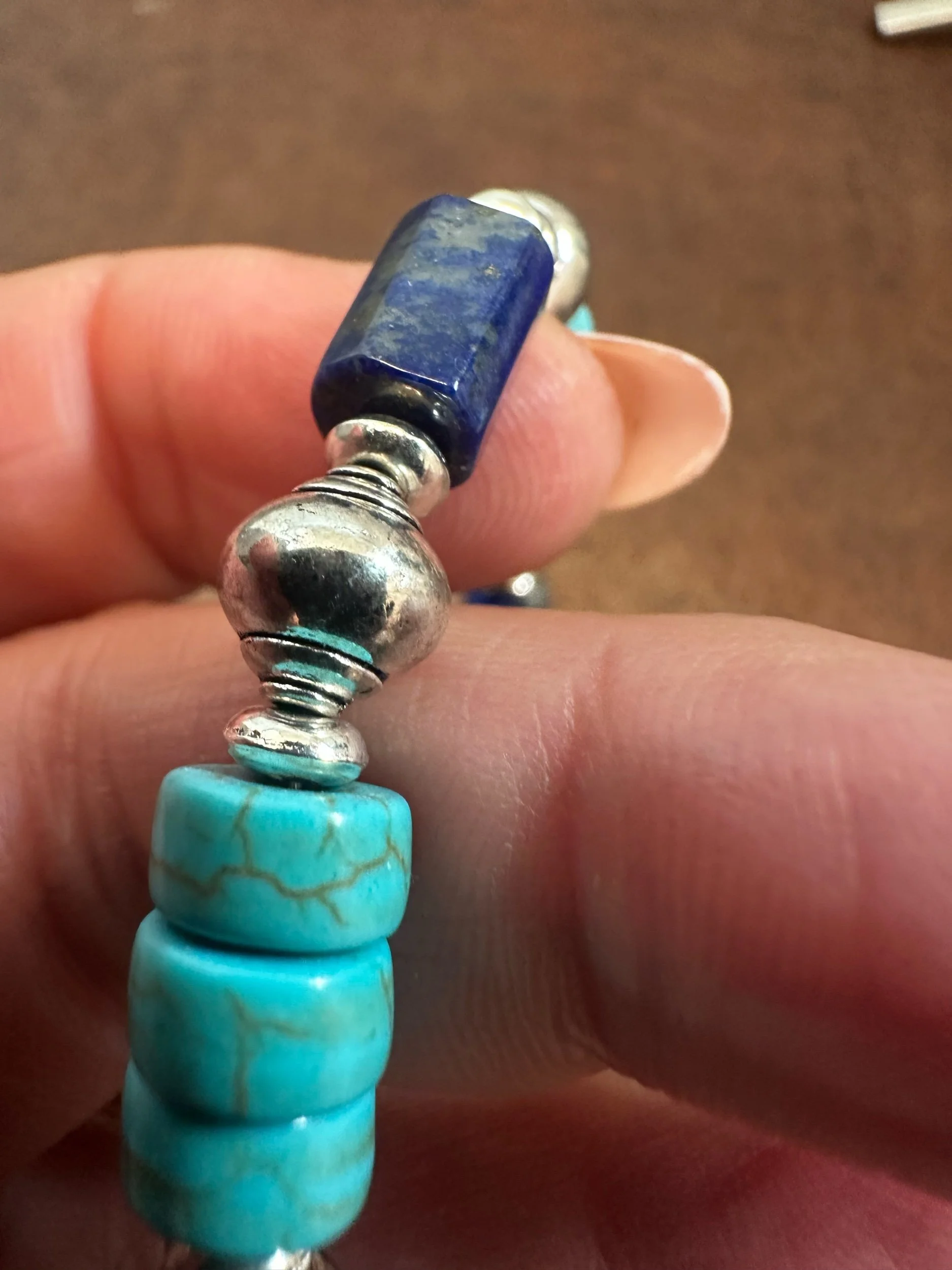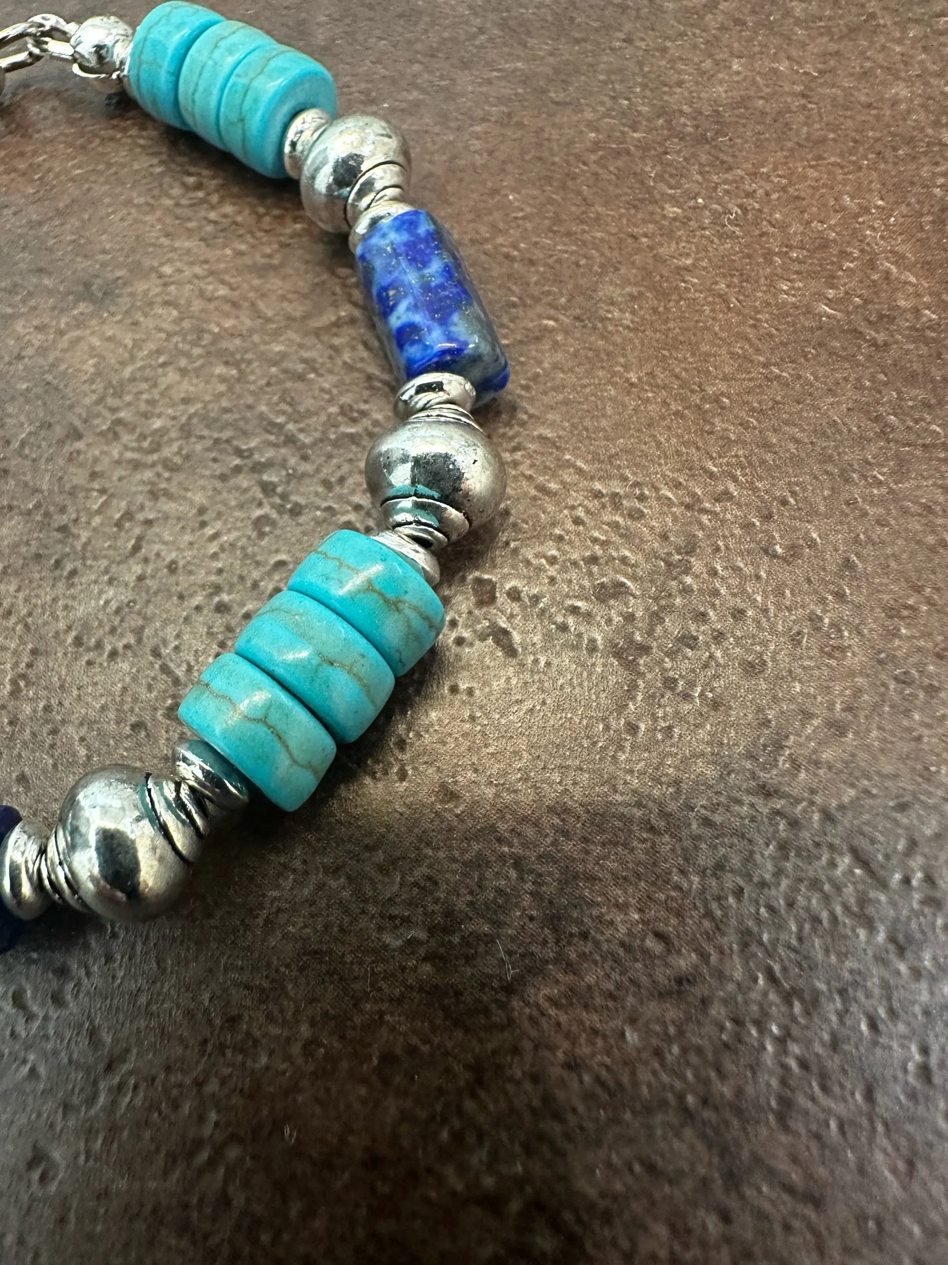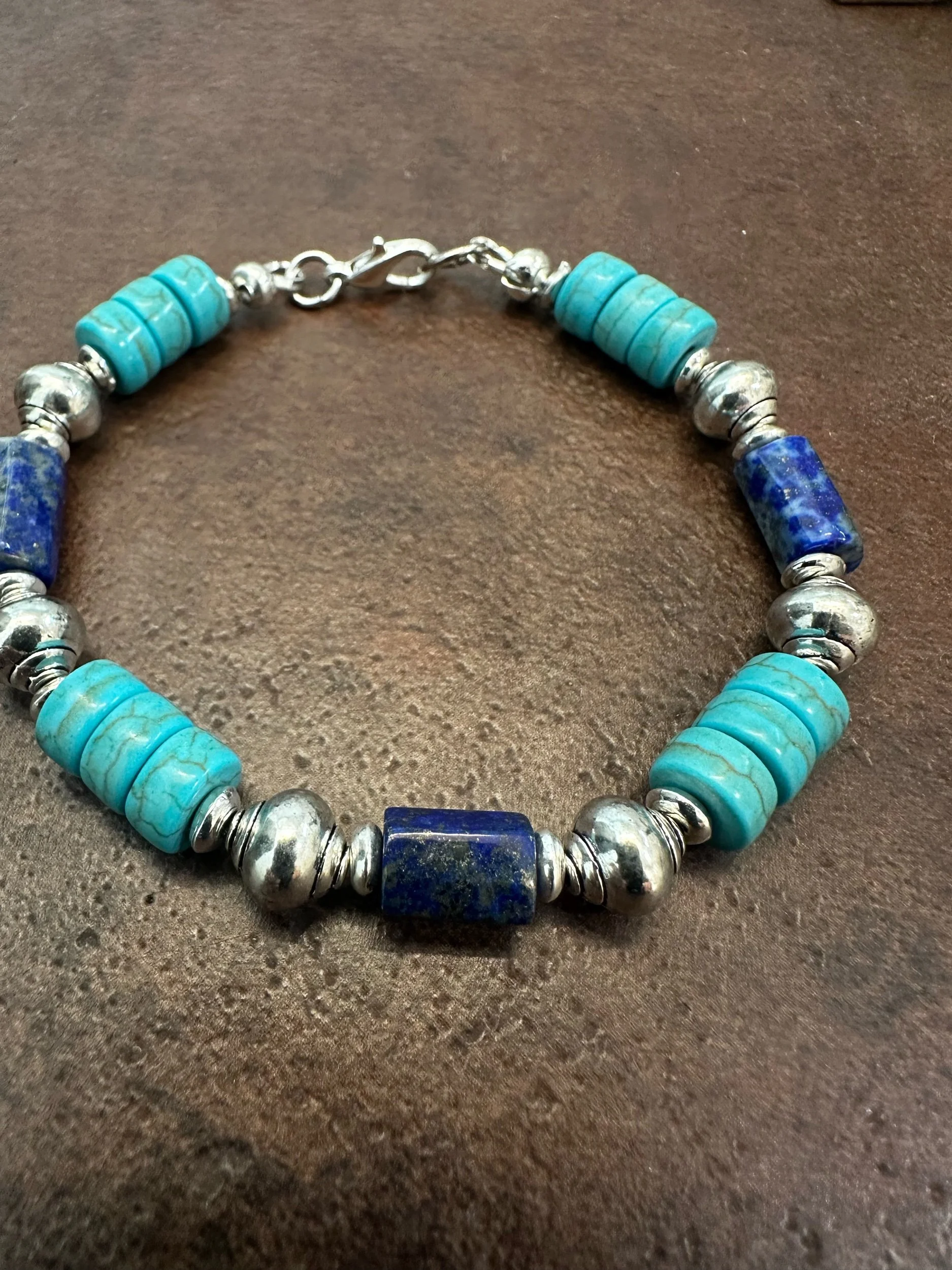 This exquisite 8in bracelet showcases a harmonious blend of deep blue lapis lazuli and turquoise Howlite beads, beautifully accented with silver-toned elements. The alternating pattern of beads creates a visually striking design, inspired by southwestern aesthetics. Its timeless elegance makes it a versatile addition to any jewelry collection.