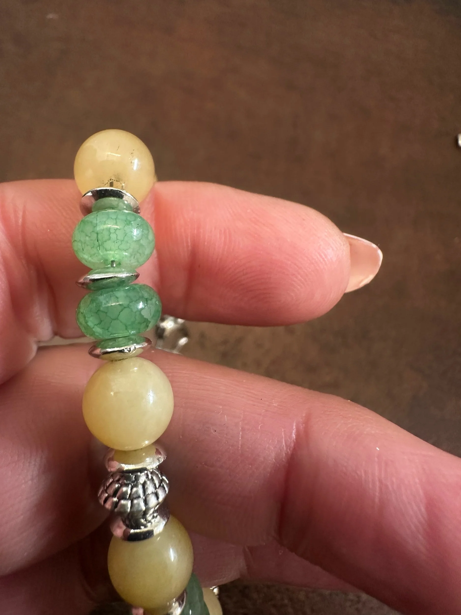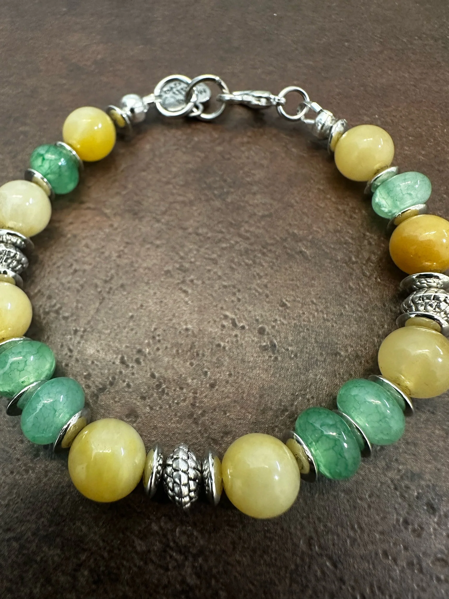 This exquisite artisan 8in bracelet features vibrant green dyed agate paired with sunny yellow aventurine beads, all set in elegant silver. A perfect accessory to elevate your style.