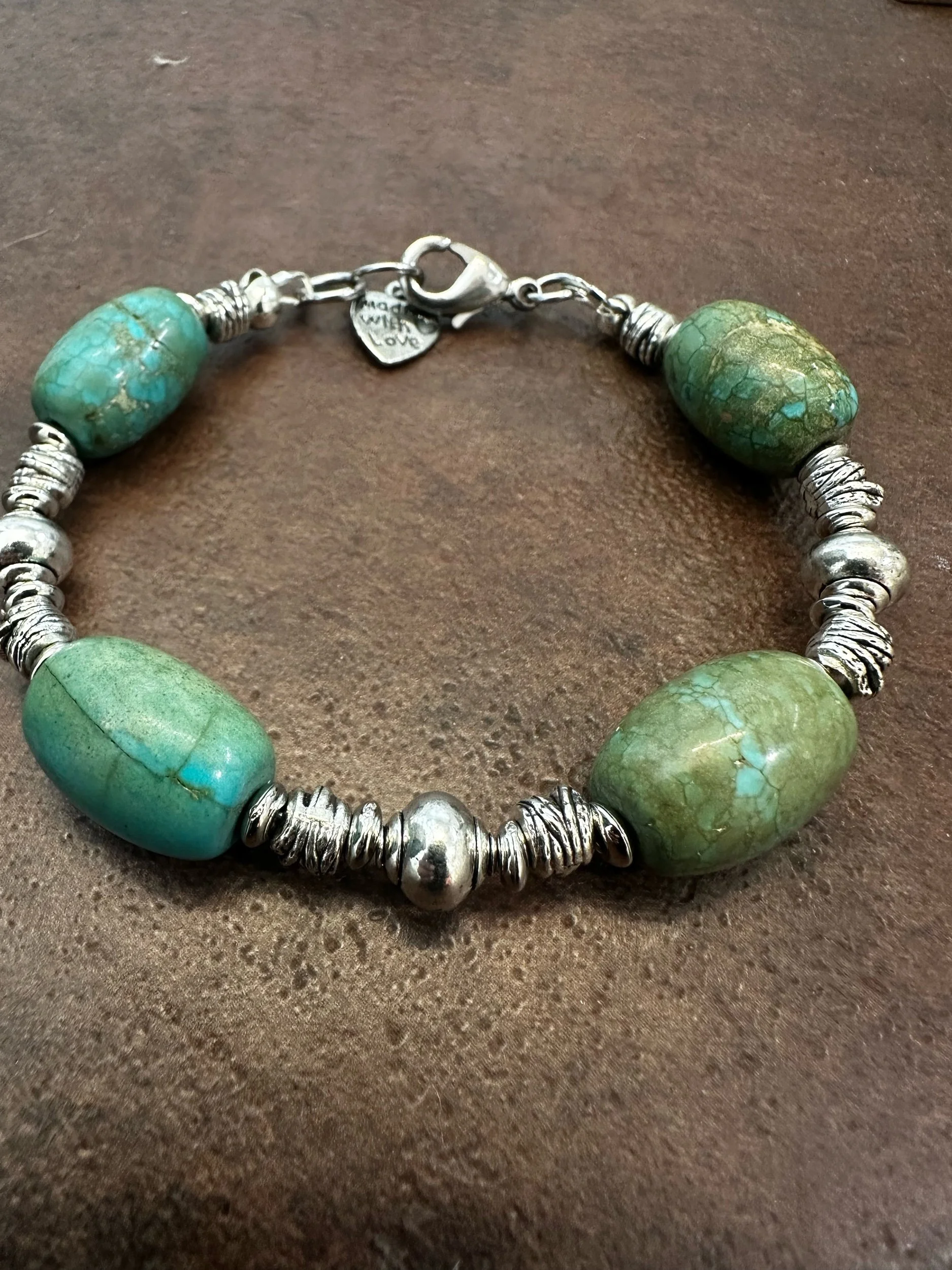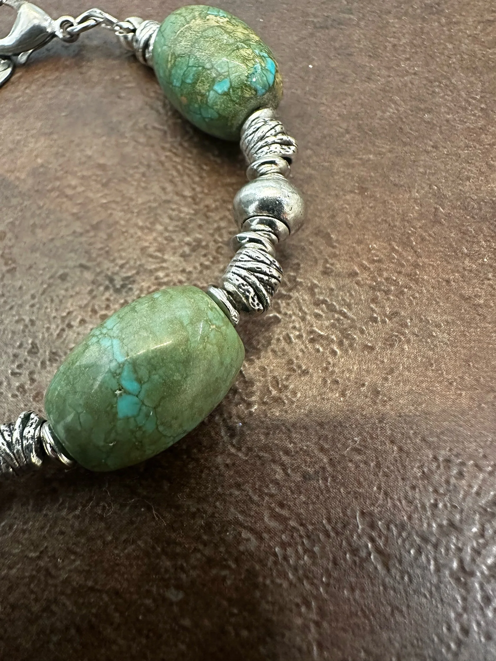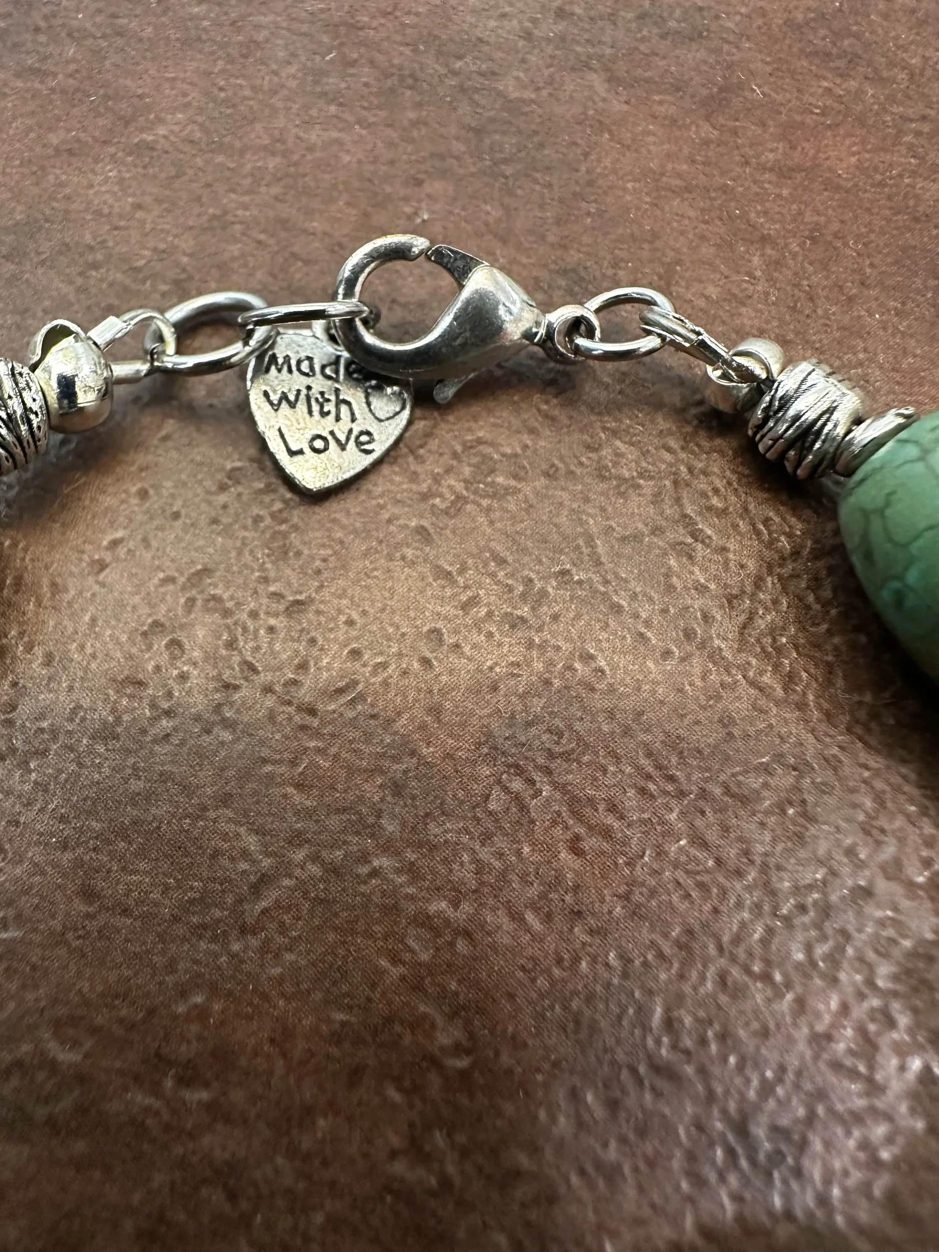This exquisite 8in bracelet showcases vibrant green Howlite stones paired with polished silver accents, creating a harmonious blend of natural beauty and elegance. The irregular shapes of the stones add an organic touch, while the silver components provide a sleek contrast. Perfect for those who appreciate a bohemian aesthetic, this piece is a timeless addition to any jewelry collection.