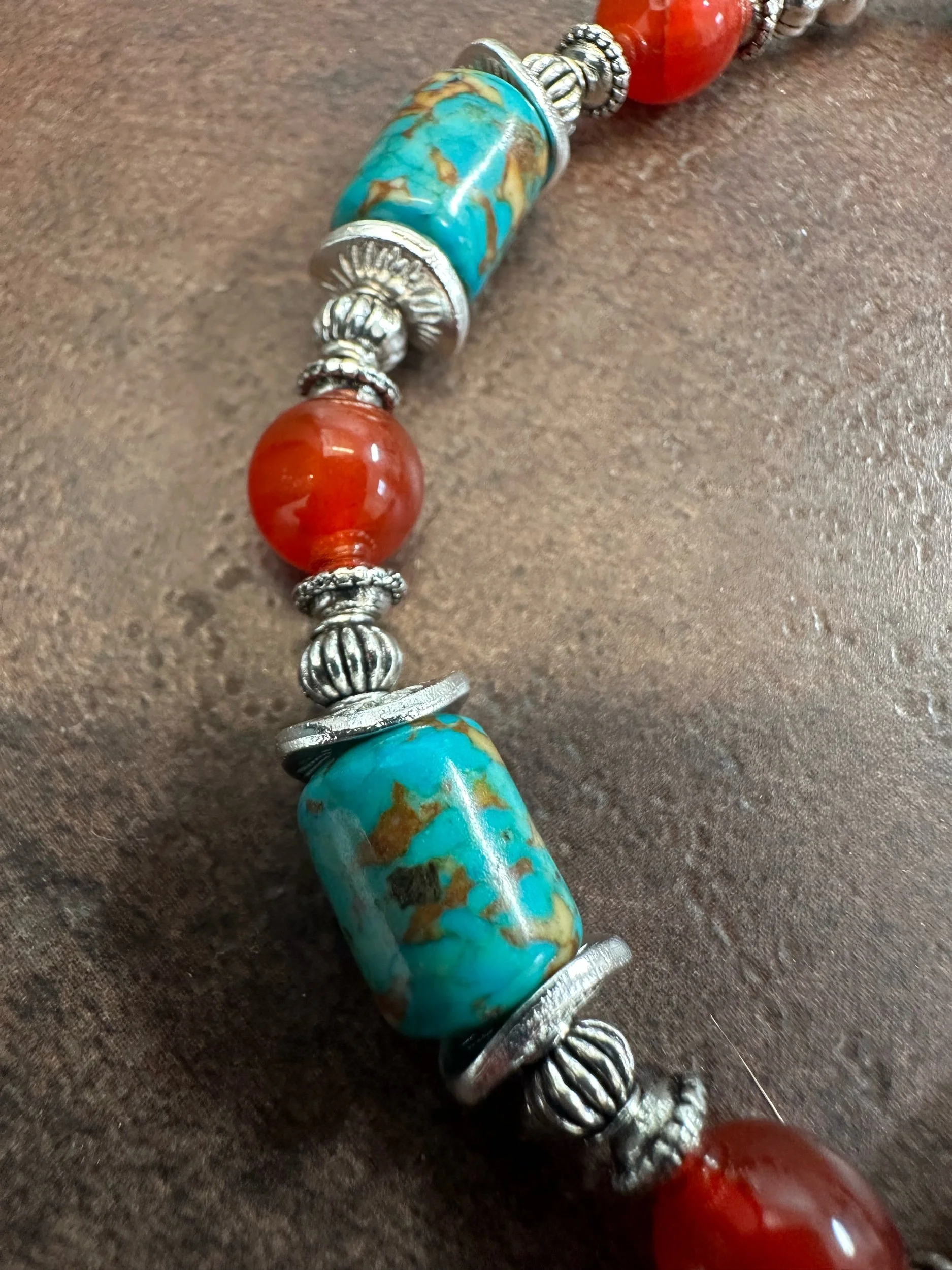 Elegant turquoise Howlite and orange carnelian beaded 8.5in bracelet with silver accents. Perfect for adding a pop of color to any outfit.